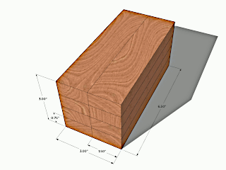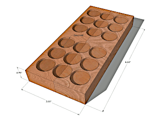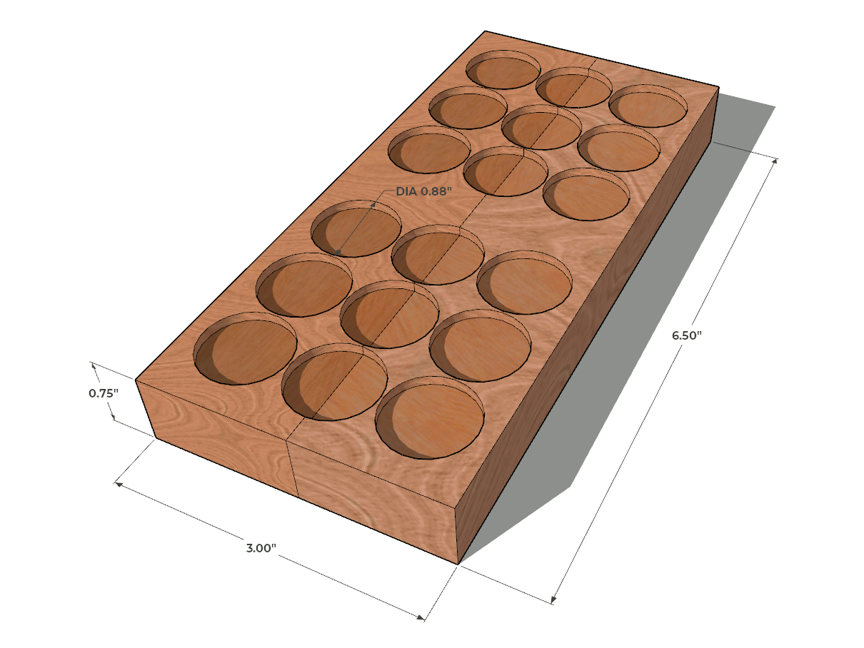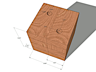 The dice were constructed using 1"x2" (actual 0.75"x1.5") poplar board. The final die dimensions were 2.9"x2.9"x2.9". I cut 8 boards to a length of 6.5". Two boards were glued on edge to create a 0.75"x3"x6.5" board. In the first prototype I drilled eight 1" holes in the board (four holes for each die) using a spade bit and drill press. In the second prototype I drilled eighteen 7/8" diameter holes to a depth of 0.08". I placed two nickels in each hole with a small amount of caulk to prevent the nickels from rattling. The total weight of the nickels was 3.2 ounces per die. The boards were glued to create a block 3"x3"x6.5". The block was cut in half resulting in a pair of dice. Each side was trimmed and sanded. The edges were rounded with a 1/2" roundover bit.